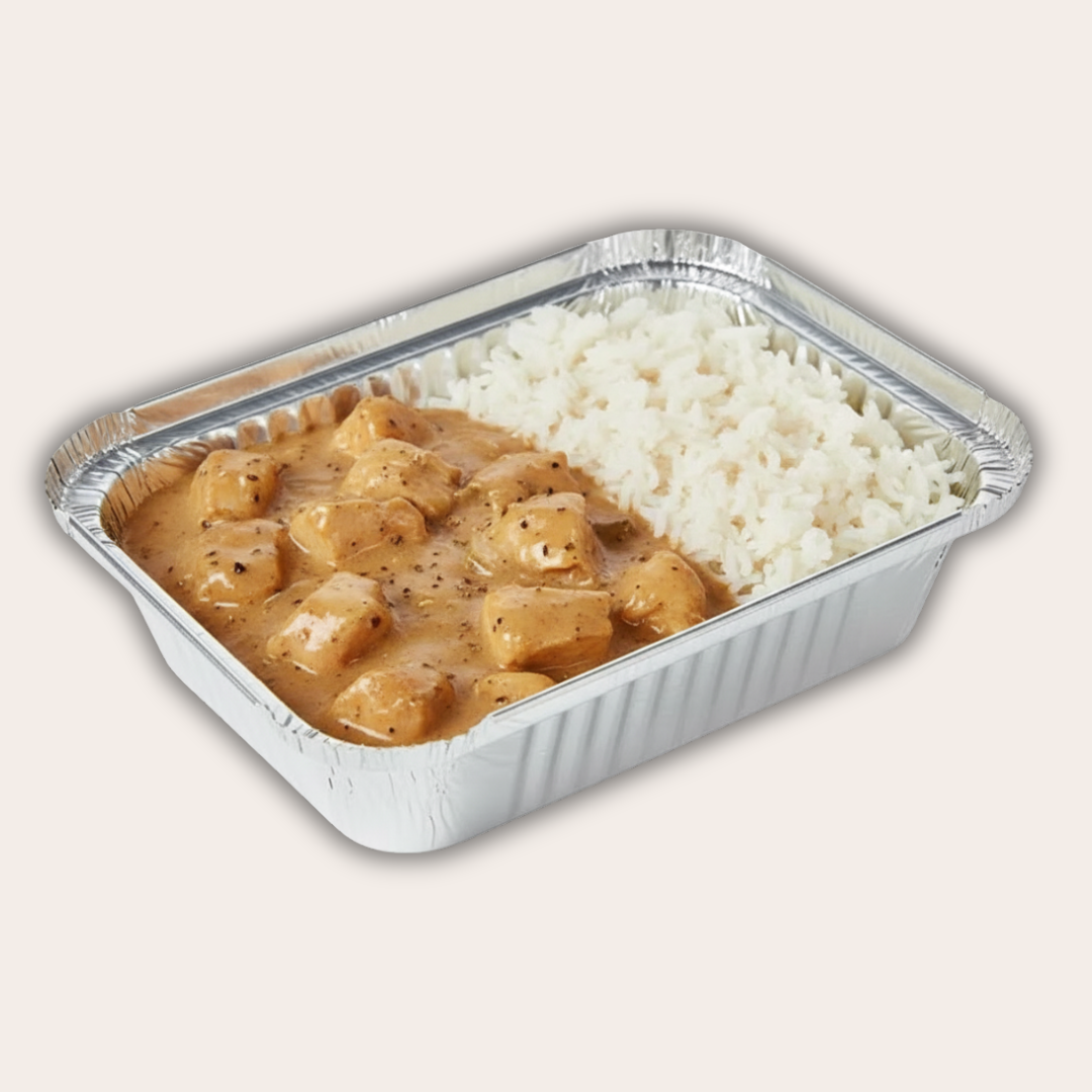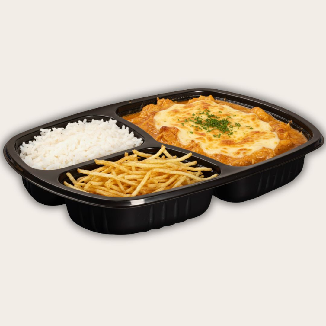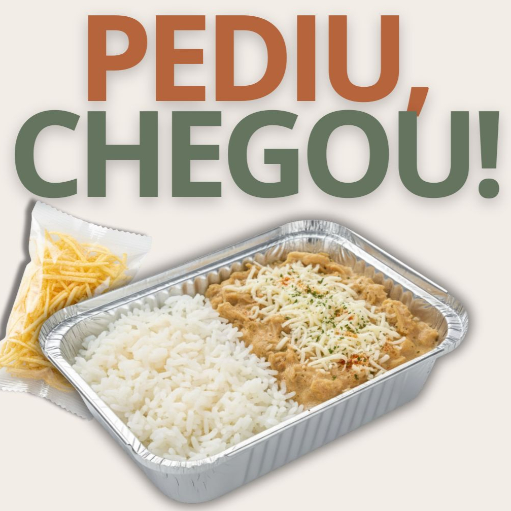 Fricassê de frango no creme de milho coberto com queijo. Arroz branco soltinho al dente. Tudo com temperos naturais. Aprox. 550g.
