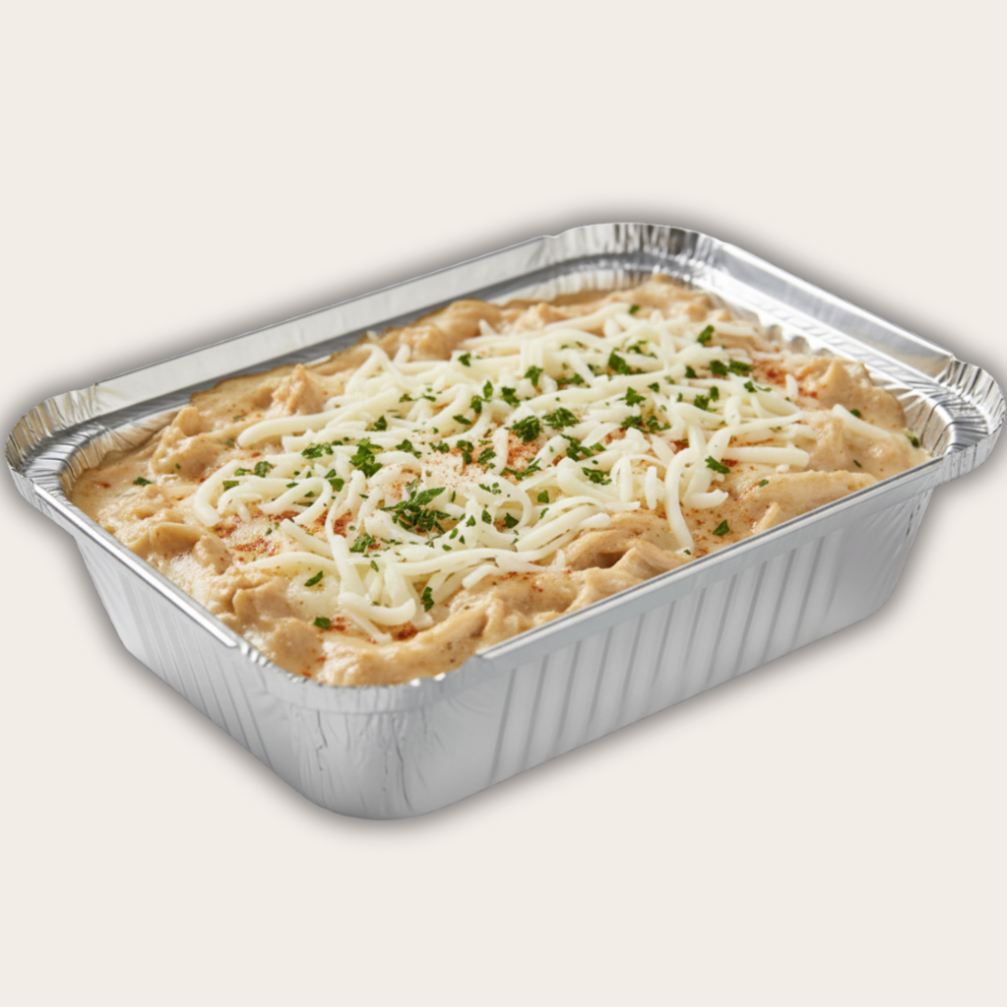 Feito com peito de frango refogado com temperos naturais, creme de milho com requeijão e batata palha. Aprox. 350g.