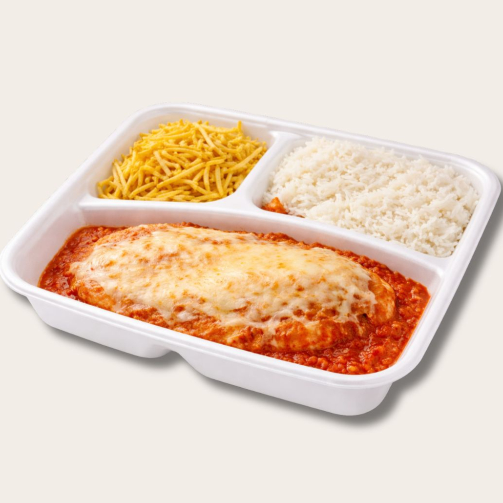 Filé de peito de frango empanado na farinha Panko, sequinha e crocante, coberto com molho de tomate artesanal e queijo muçarela ralado. Acompanha arroz branco soltinho e batata palha. Aprox. 500g.
