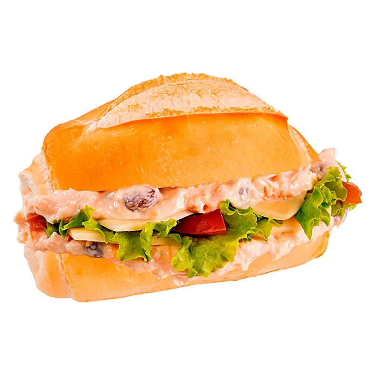 Pão francês, patê de frango, presunto, mussarela, alface e tomate.