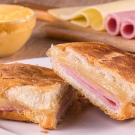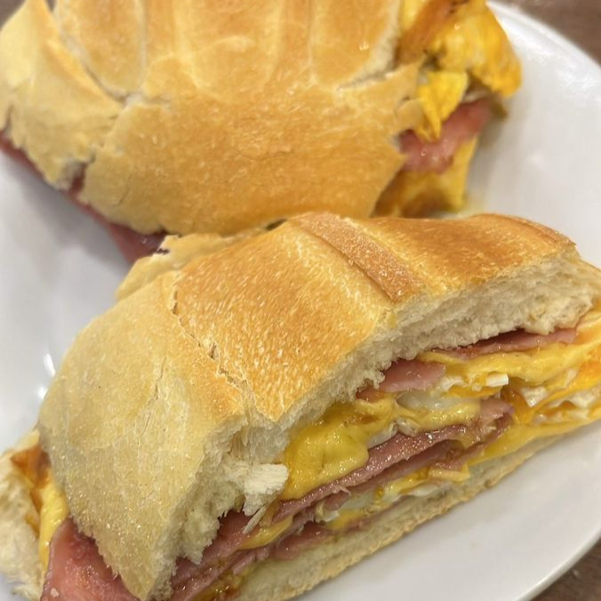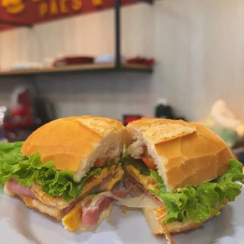 Pão francês, mussarela, presunto, ovo, alface e tomate.