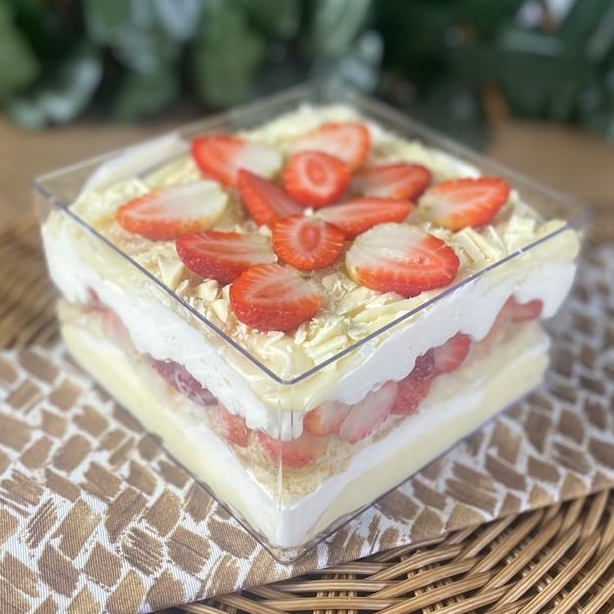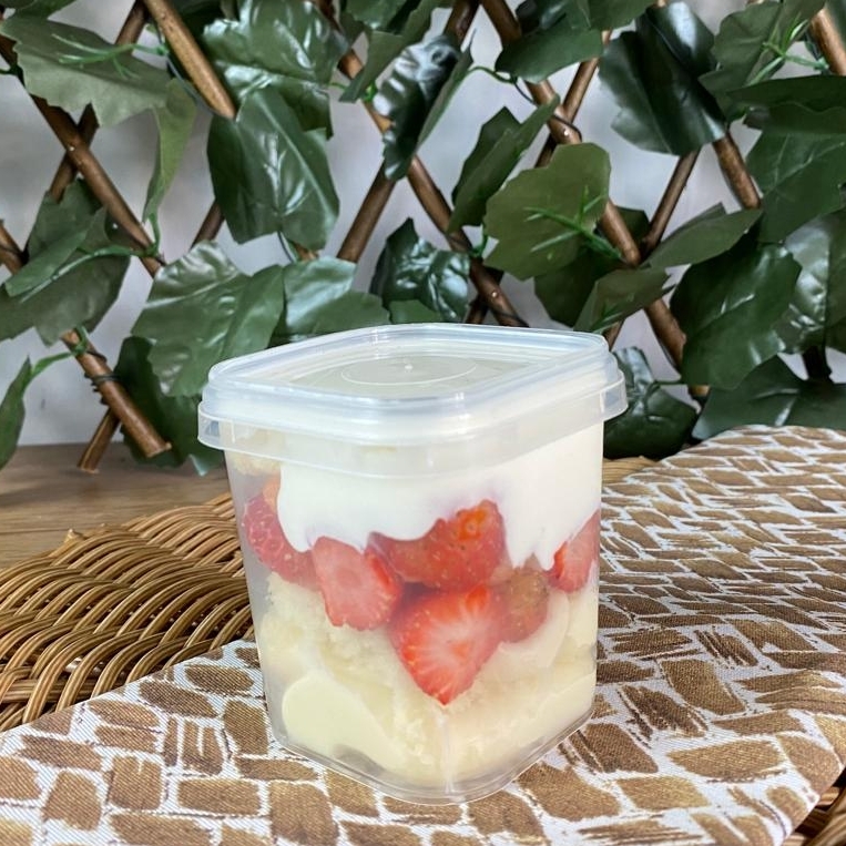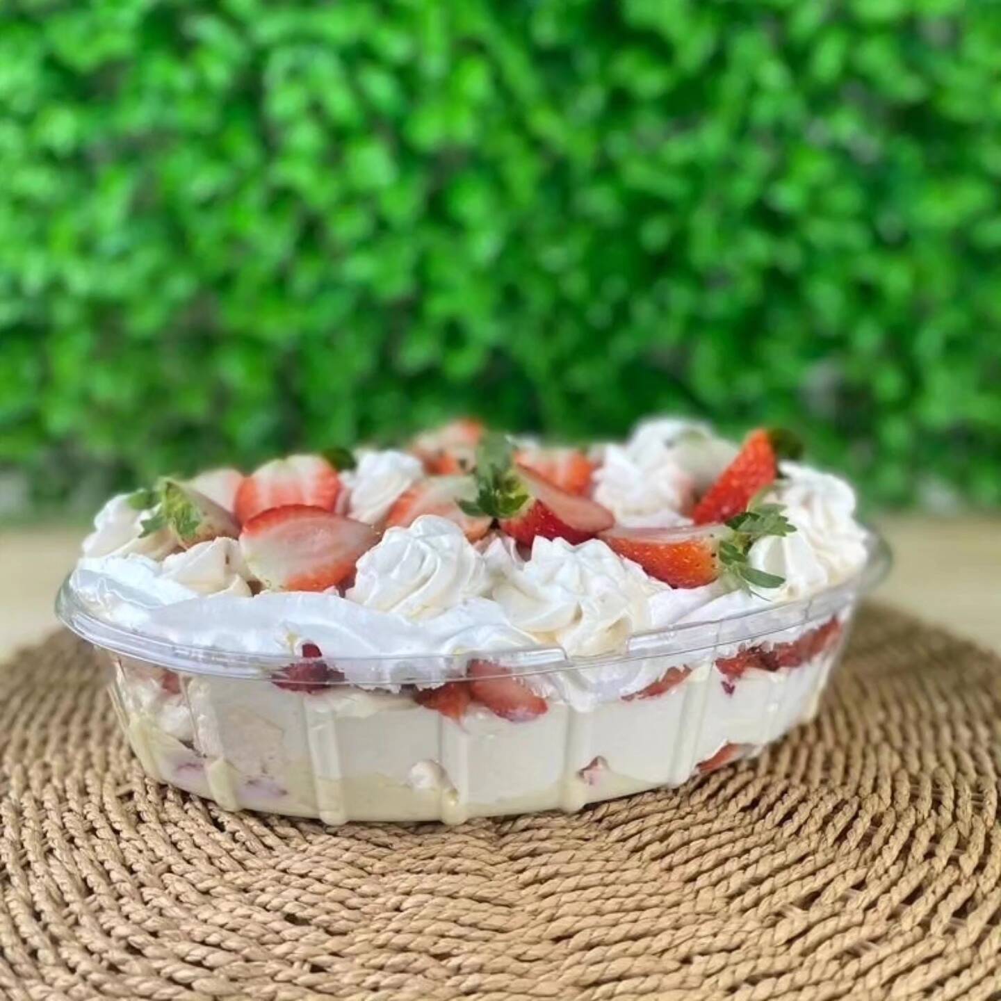Bolo de baunilha,molhadinho.creme e mousse de ninho, morangos fresco. pote de 220ml. Serve uma pessoa