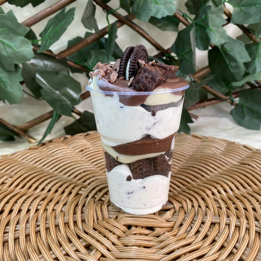 Creme de chocolate, ninho, moousse de ninho e cookies, pedaços de brownie intenso. Serve uma pessoa. Copo 250gramas