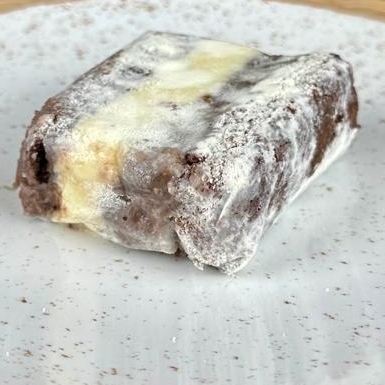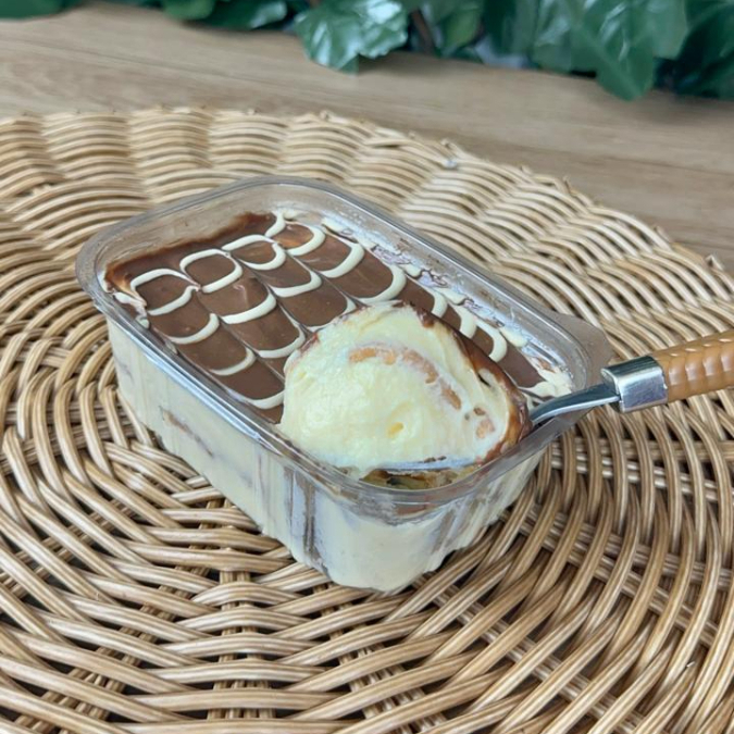 Delicioso creme levemente amanteigado intercalado com biscoitos cobertoncom ganache de meio amargo, pesonmedio 180gr, serve 1 pessoa