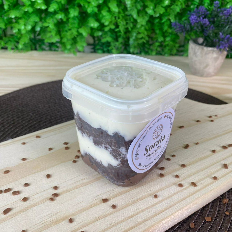 Finas camadas de bolo de chocolate, intercalado creme de coco e birgadeiro cremoso.Serverve uma pessoa,Embalagem de220ml .
