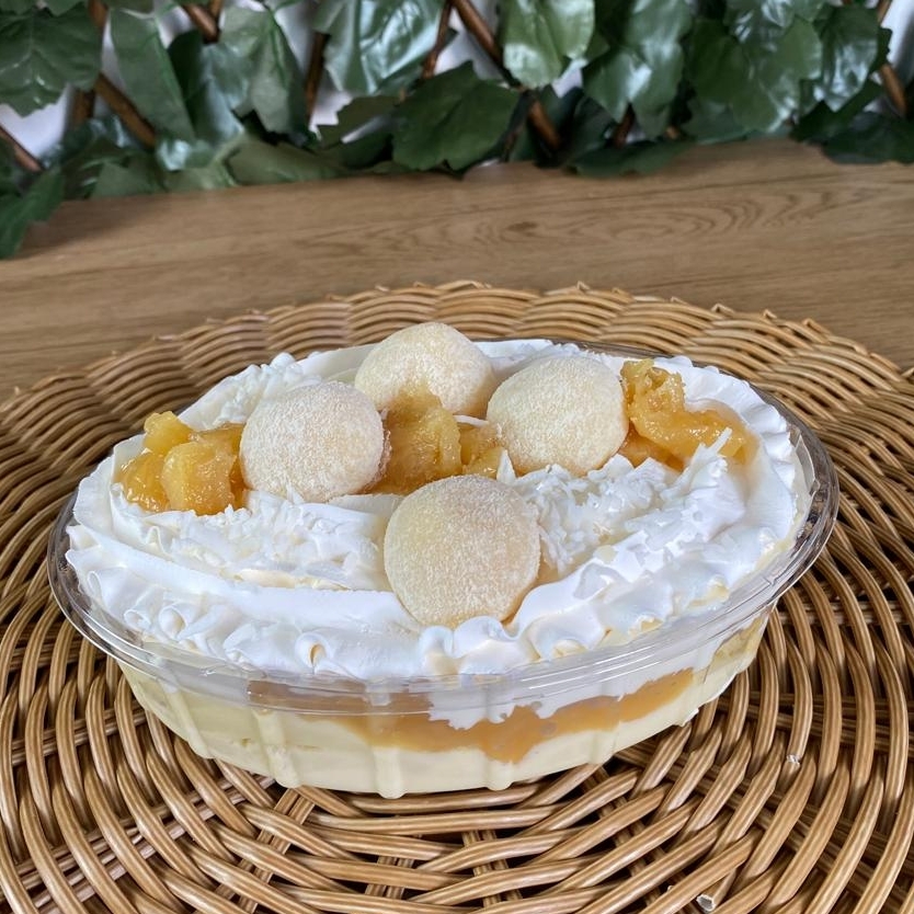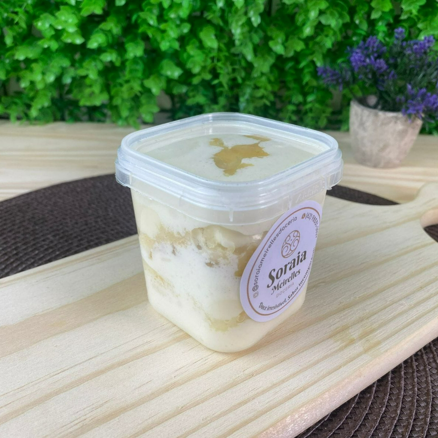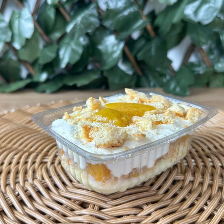 Creme 4 leites, pêssego, bolacha champanhe, mousse de ninho, serve 1 pessoa, peso médio 180gr