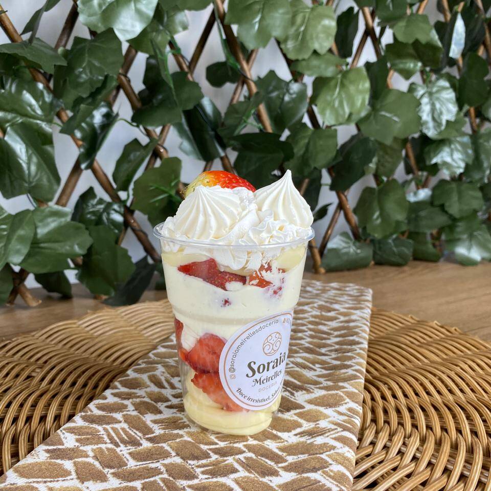 Creme de ninho, suspiros, morango fresco e chantininho. Serve uma pessoa. Copo 230 gramas