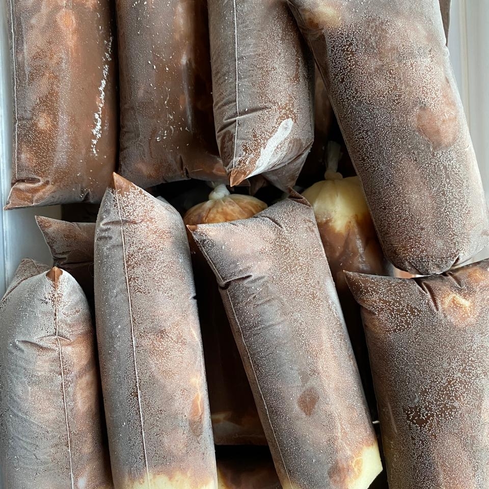 massa molhadinha de chocolate, recehado com brigadeiro cremoso de chocolate e brigadiero de ninho.Peso medio100gramas cada28