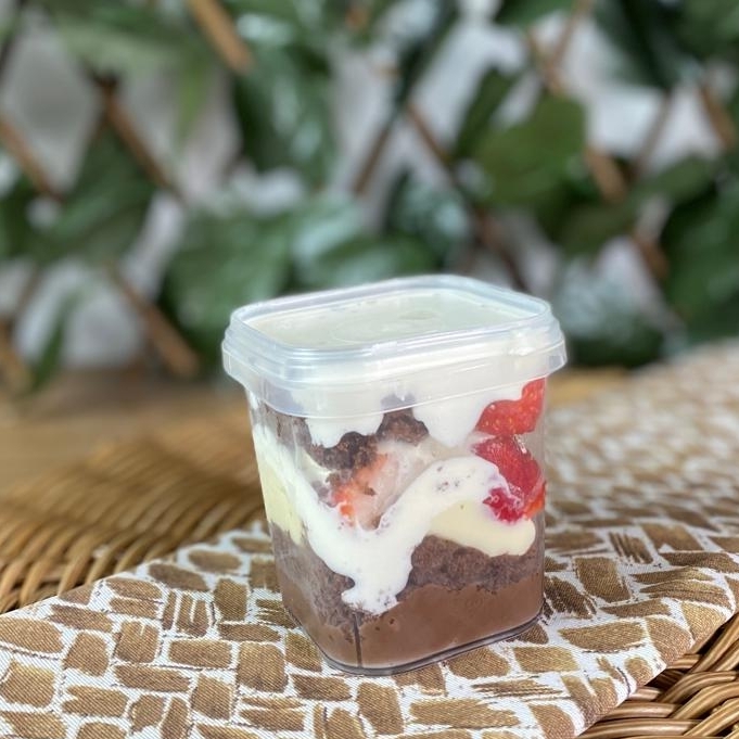 Finas camadas de bolo de chocolate molhadinho, creme de brigadeiro ao leite, mousse de niho e morangos frescos. Serve 1 pessoa. Embalagem de 220ml