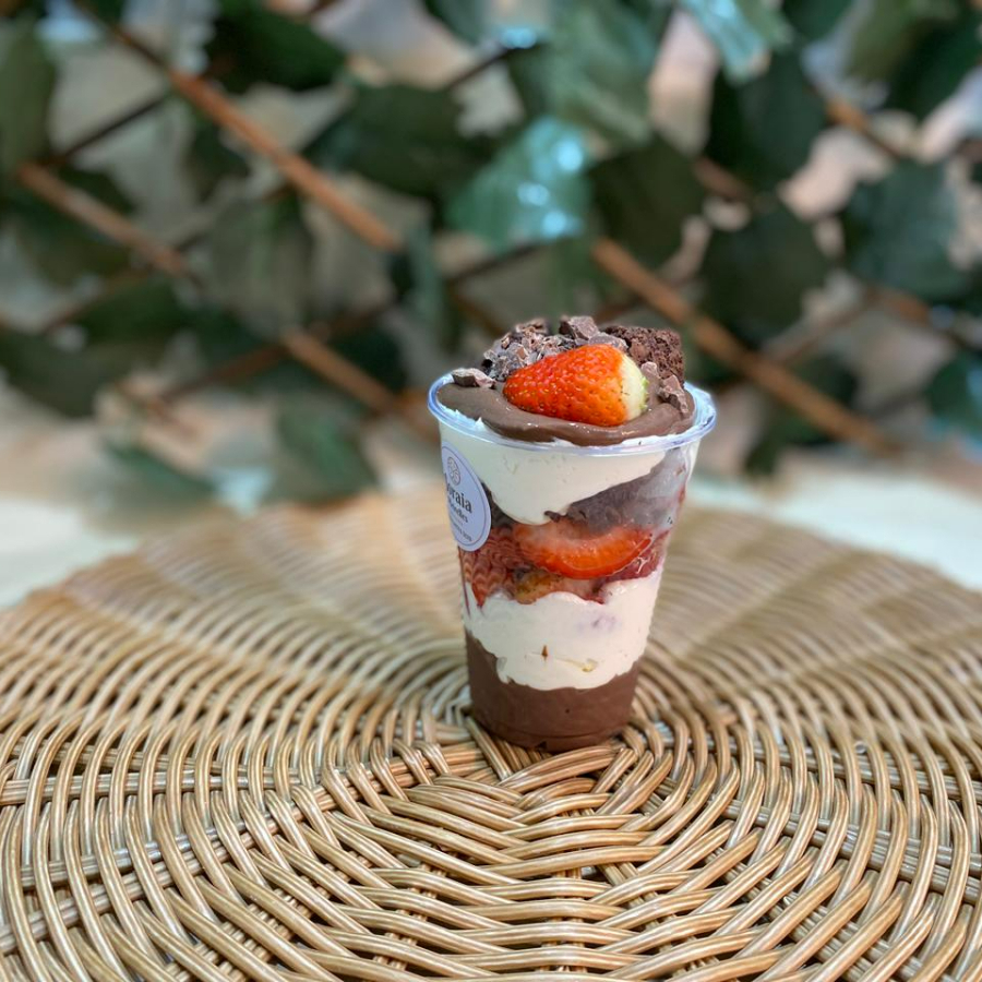 Delicioso creme de chocolate ao leite, mousse de ninho especial, brownie intenso, morangos fresco.Serve uma pessoa. peso medio 250 gramas