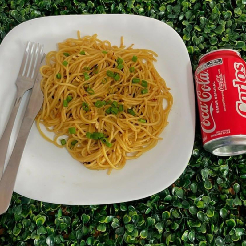 Delicioso espaguete, temperado no azeite, alho, sal, pimenta do reino e finalizado com cebolinha, acompanhado de uma bebida de 350 ml à sua escolha.