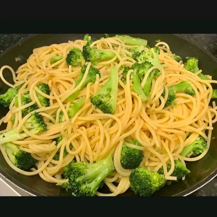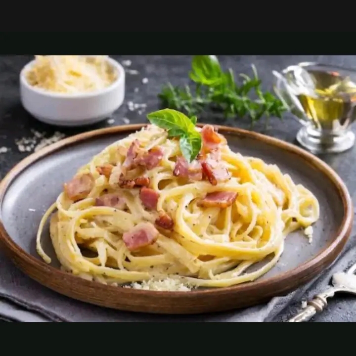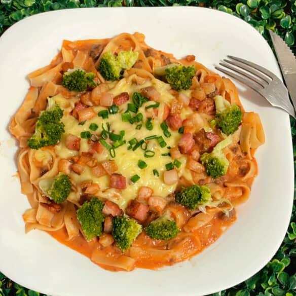 Delicioso espaguete, banhado ao molho branco cremoso, com pedaços e bacon e brócolis.Finalizado com queijo mussarela e cebolinha