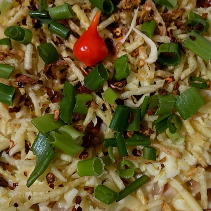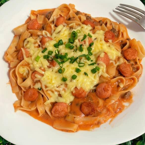 Deliciosa massa espaguete, banhada ao molho misto (bolonhesa e branco), com pedaços de linguiça fina de frango, e finalizado com queijos mussarela e cebolinha, aproximadamente 600 Gramas.