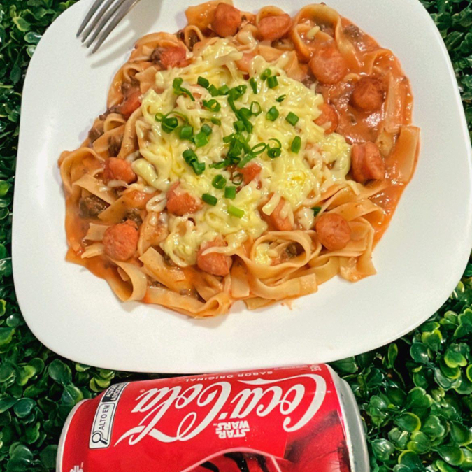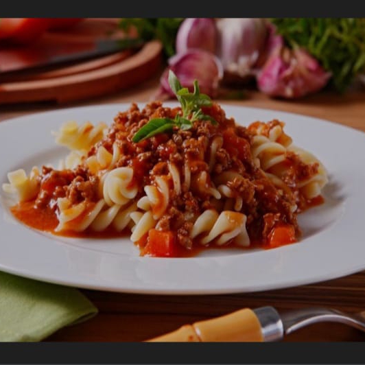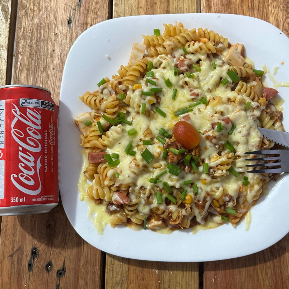 Delicioso macarrão parafuso, banhado ao molho vermelho, enriquecido com uma generosa porção de carne bovina moída, finalizado com mussarela ralada e cebolinha. Para acompanhar, um refrigerante de 350 ml l, à sua escolha.