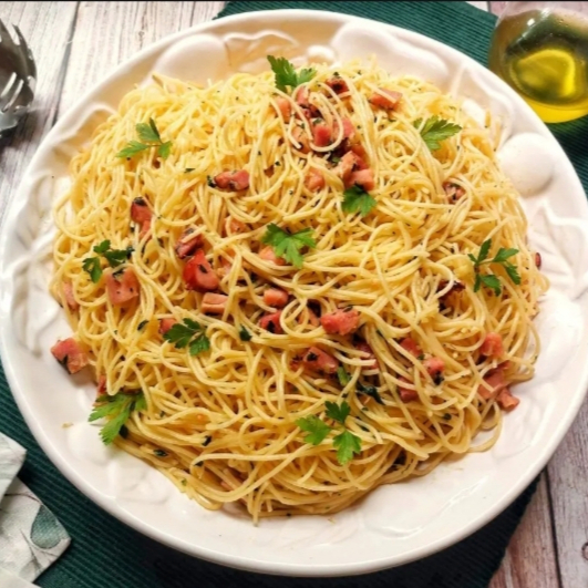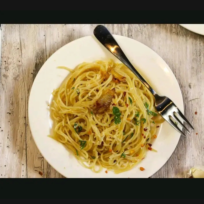 Delicioso espaguete, temperado no azeite, alho, sal , pimenta do reino e finalizado com cebolinha. Prato ideal para quem gosta do básico.