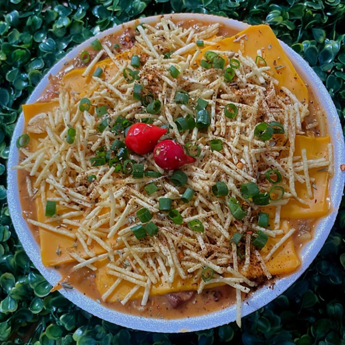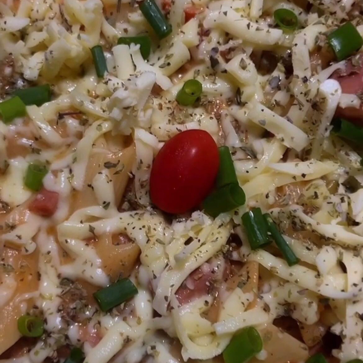Deliciosa massa penne, banhada ao molho de tomates bem temperado, e enriquecido com uma generosa porção de carne bovina moída. Finalizado com Queijo mussarela e cebolinha.