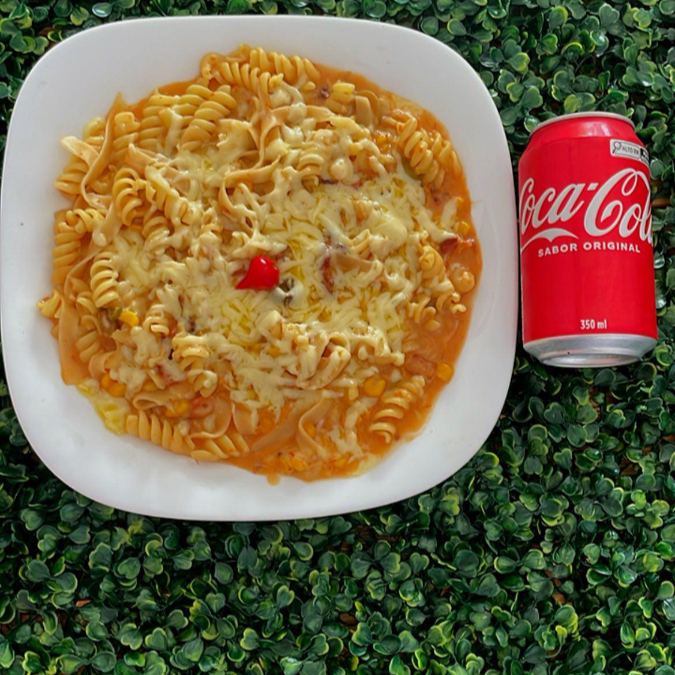 Massa parafuso, Molho Rosé, Milho, Finalizado com uma porção generosa de queijo, acompanha refrigerante de 350 ml a sua escolha.