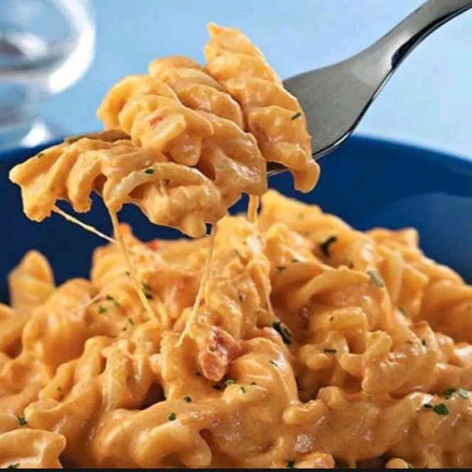 Massa parafuso, Frango desfiado,bacon, molho Rosé, queijo mussarela no meio de macarrão, finalizado com Cebolinha. São aproximadamente 600 gramas de macarrão