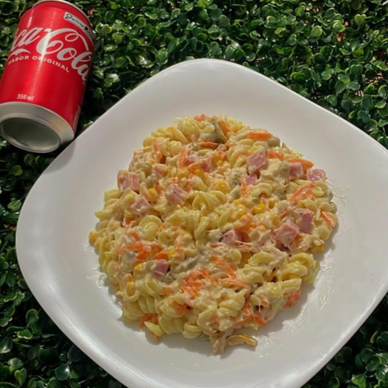 Desfrute da nossa deliciosa salada de macarrão, feita com a massa parafuso, bem incrementada com maionese cremosa, frango desfiado, presunto, cenoura ralada, azeitona, milho e ervilha. Para acompanhar, uma bebida à sua escolha.