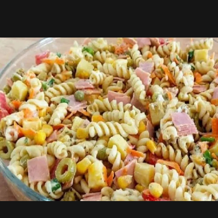Deliciosa salada feita com o macarrão parafuso na maionese, com frango desfiado, presunto em cubos, milho, ervilha, azeitona e cenoura ralada.