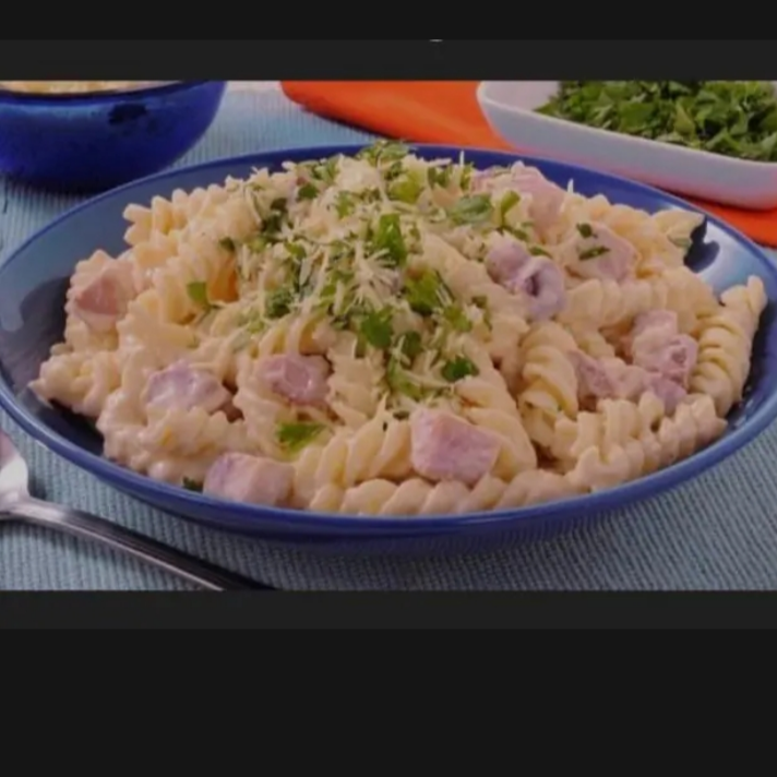 Macarrão parafuso ao molho branco cremoso, com pedaços de bacon. Finalizado com mussarela e cebolinha.