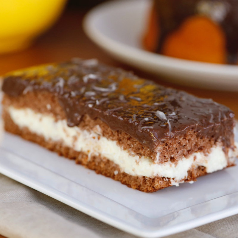 Massa de Chocolate,Cobertura de Creme de Coco com Ninho e Coco Ralado