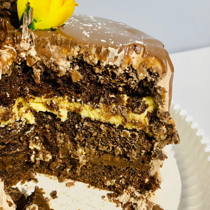 Com massa super fofinha, recheios generosos, nosso bolo é feito artesanalmente, com ingredientes selecionados e muito carinho em cada detalhe. Camadas bem recheadas Produção artesanal. Nossas fatias de bolo são armazenadas com todo cuidado em embalagem de alumínio e mantidas sempre geladinhas, garantindo mais frescor, sabor e qualidade a cada pedaço