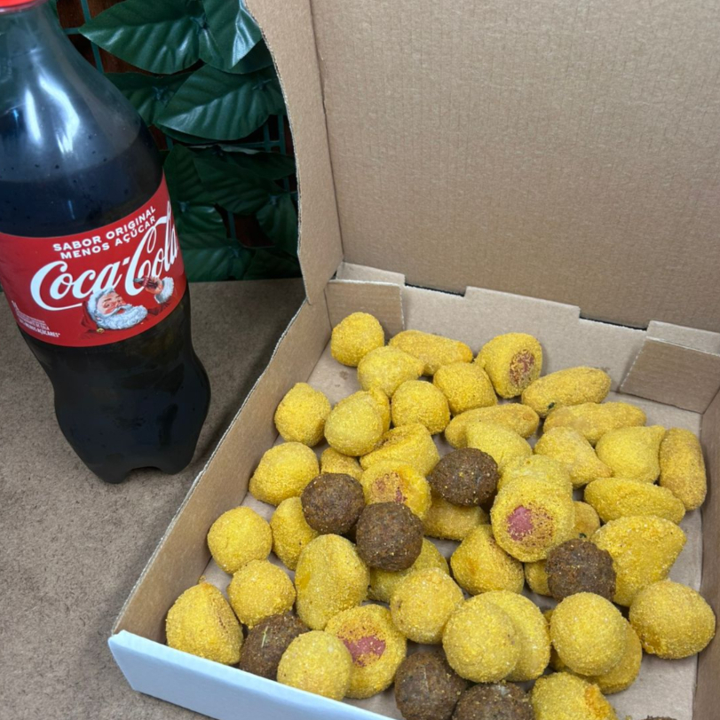 50 unidades de salgadinhos variado + 1 coca-cola de 1 LT.