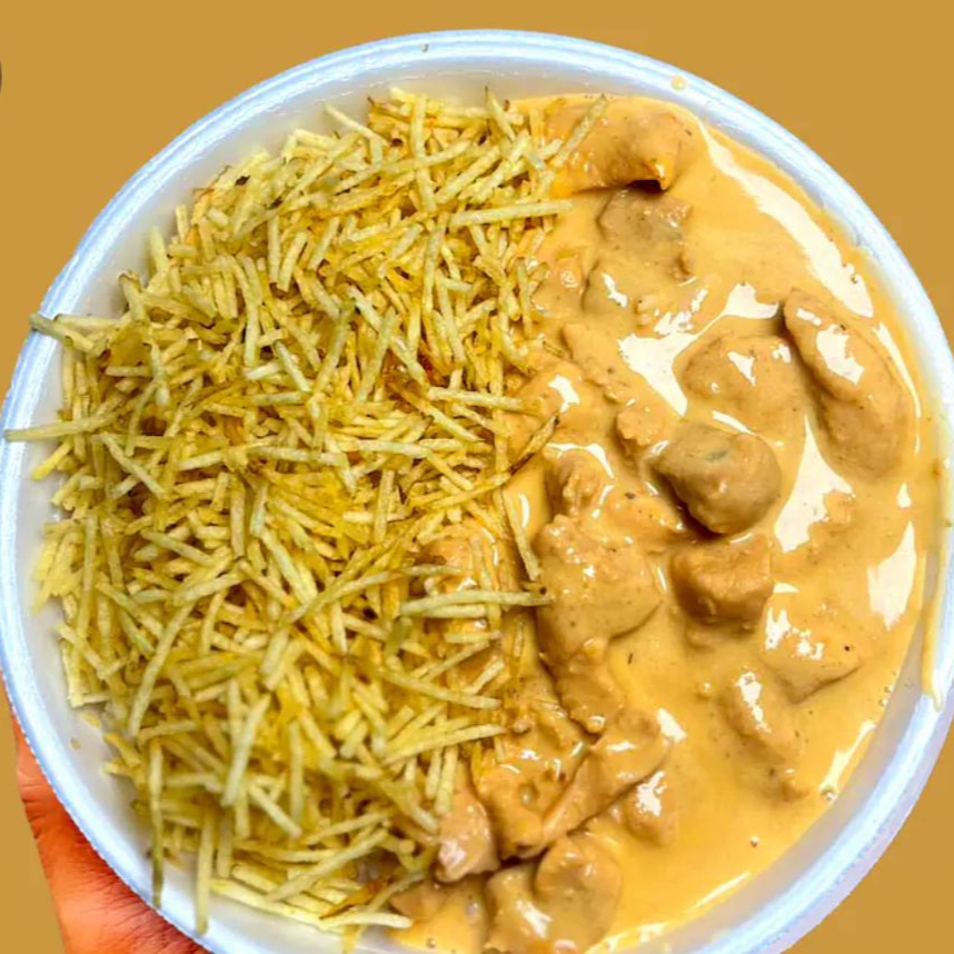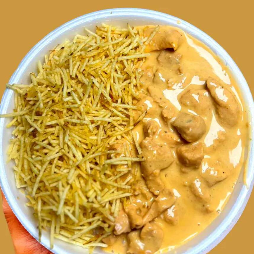 Strogonoff cremoso com arroz branco soltinho e batata palha crocante. Uma combinação clássica, feita com carinho, que entrega sabor e aconchego em cada garfada.