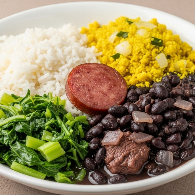 Feijoada caseira com arroz branco soltinho, farofa douradinha e couve refogada. Sabor de tradição, feita com carinho para aquecer seu dia.