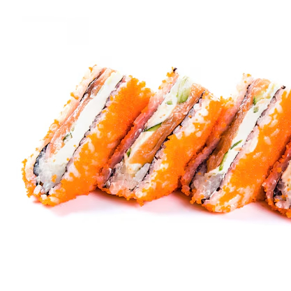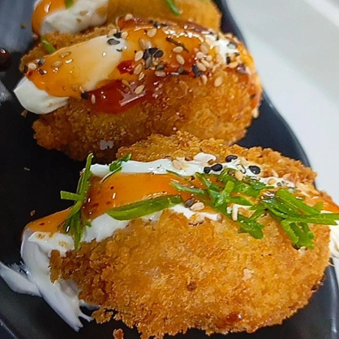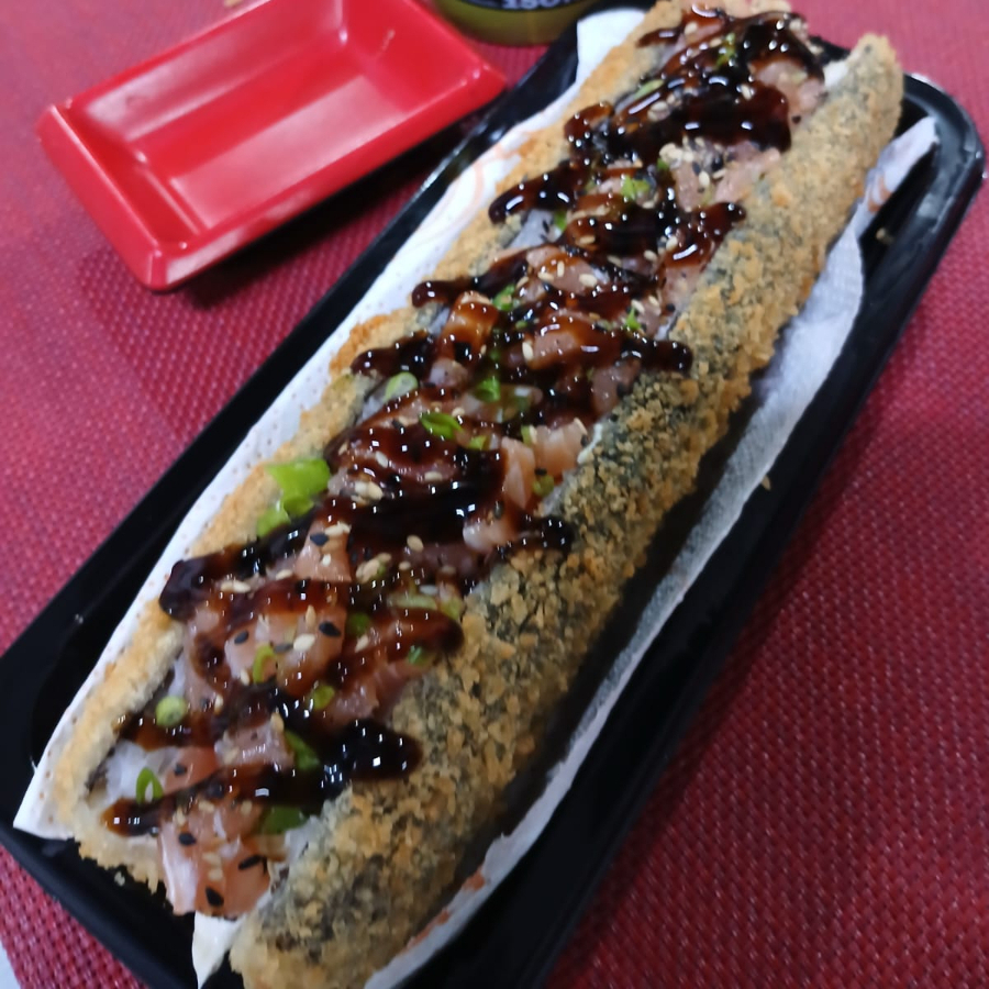 1 sushi duiche recheado com salmão e chemm chesse empanado e frito.