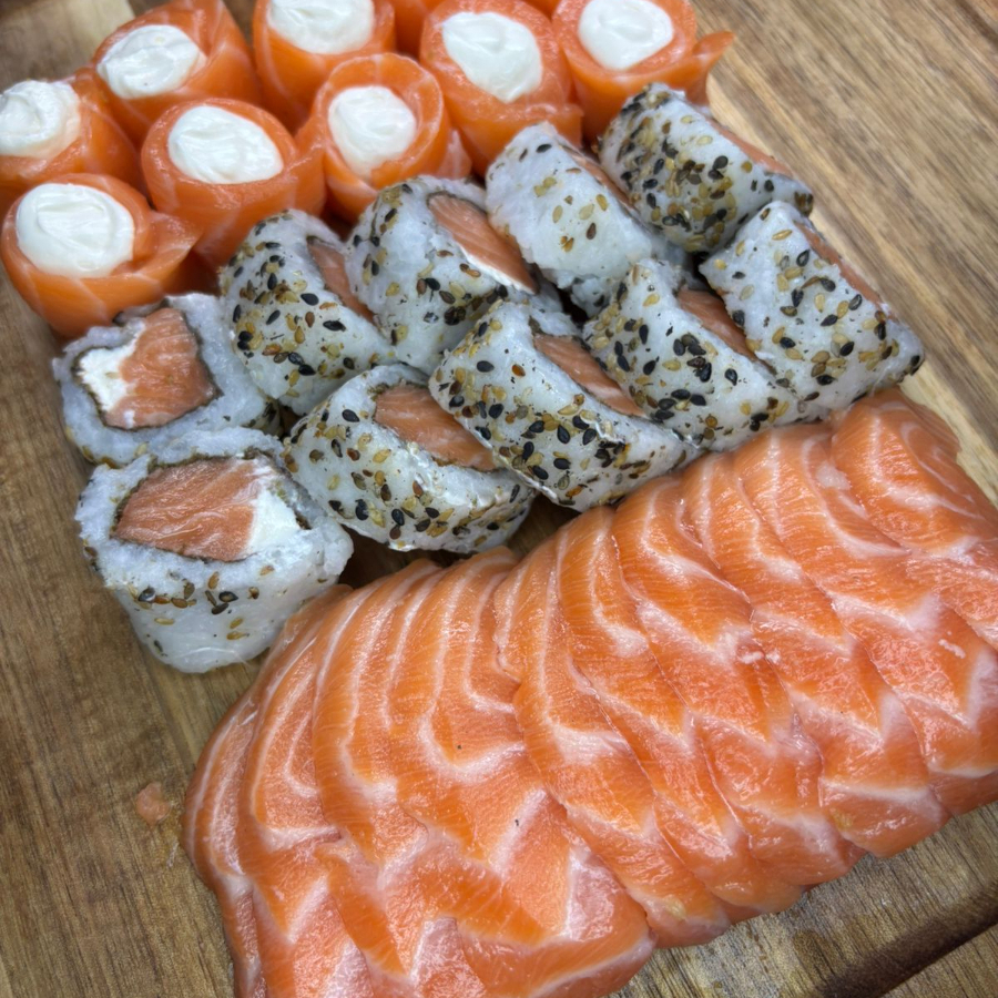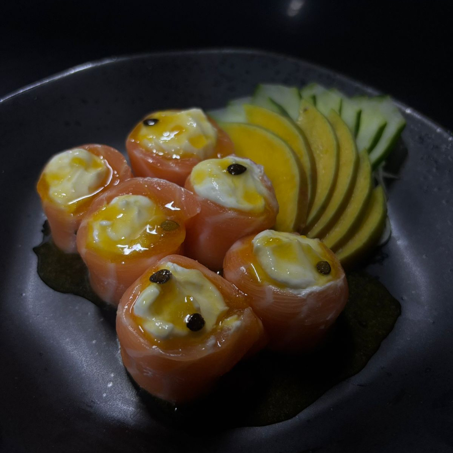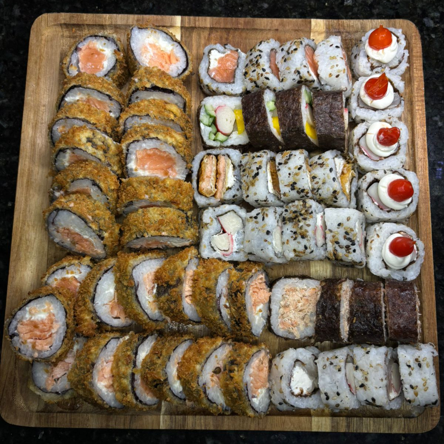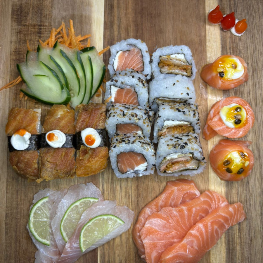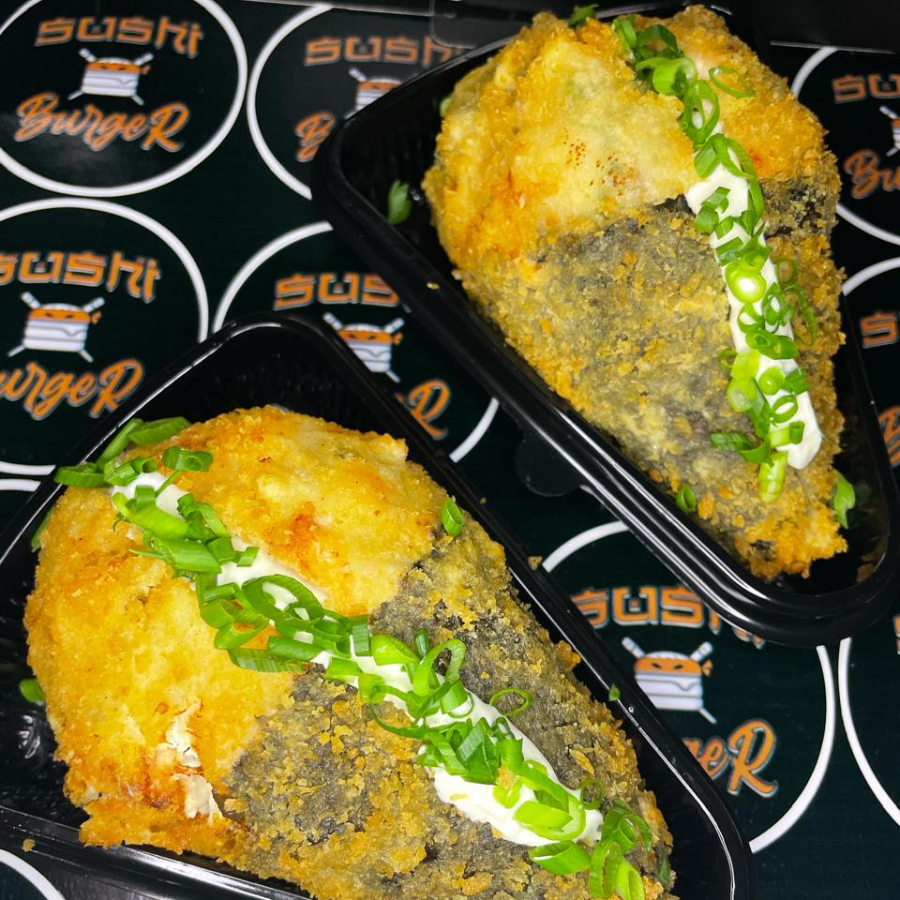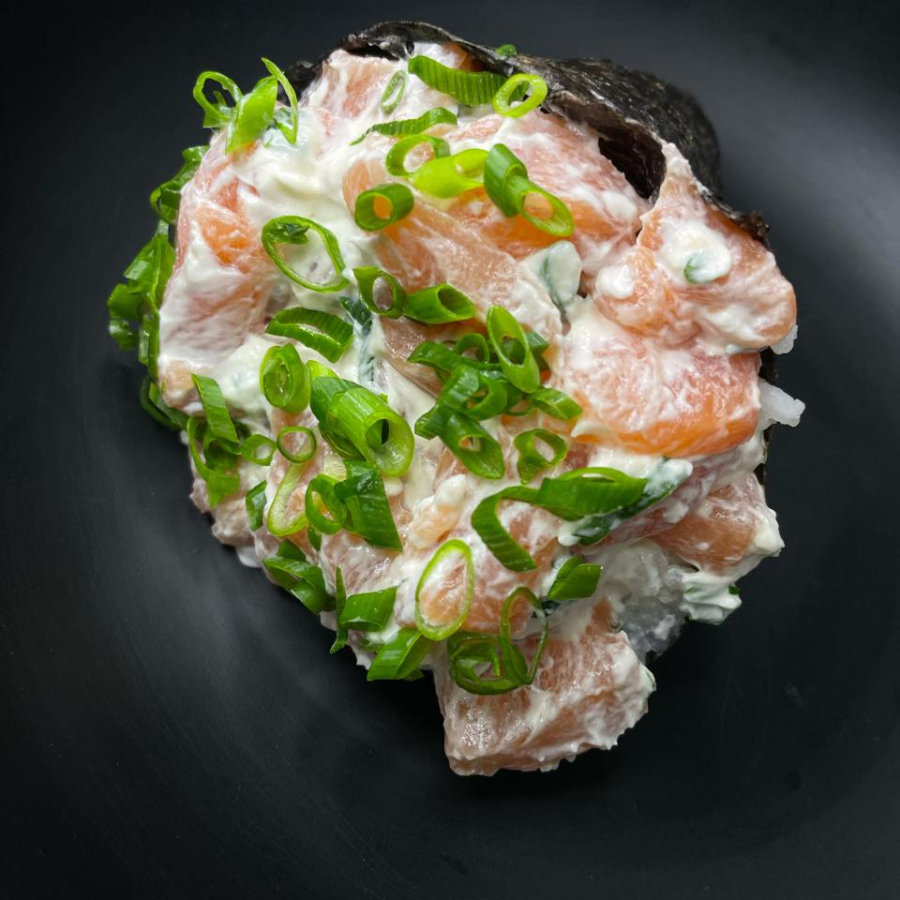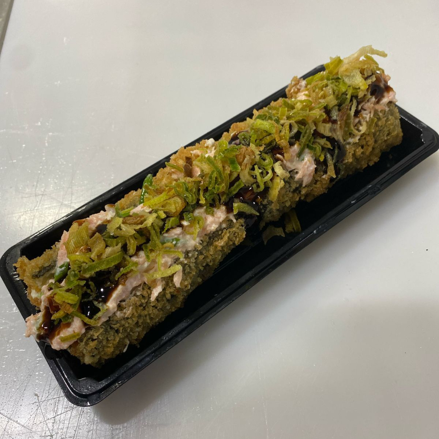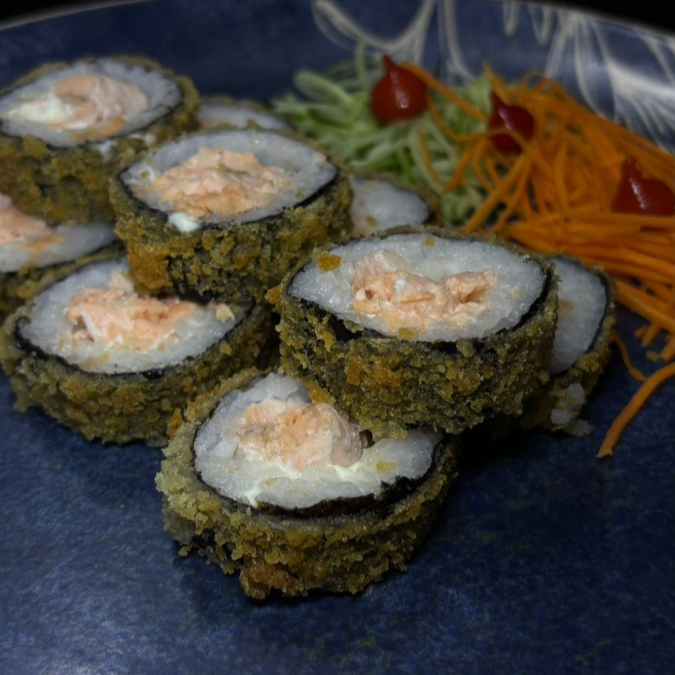Arroz japonês empanado na farinha panco e frito, filé de salmão cream cheese, cebola, tomate e alface selado