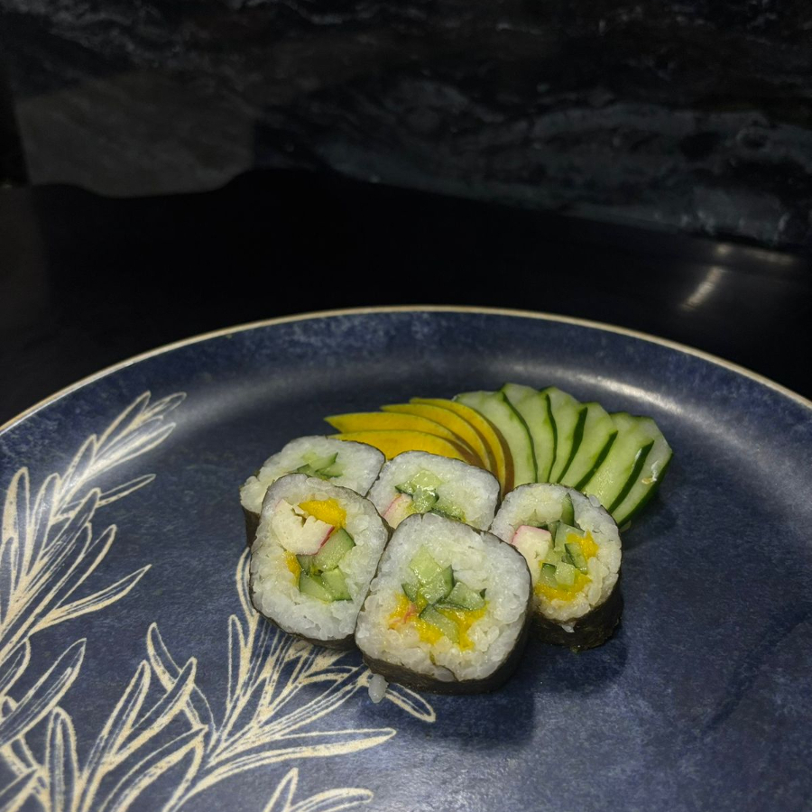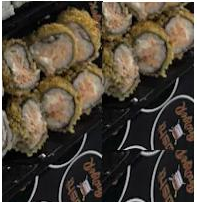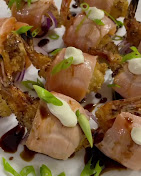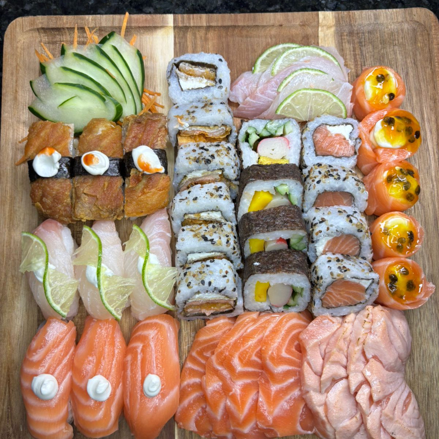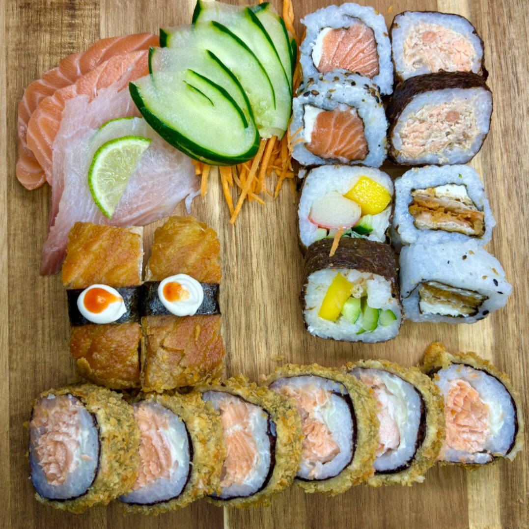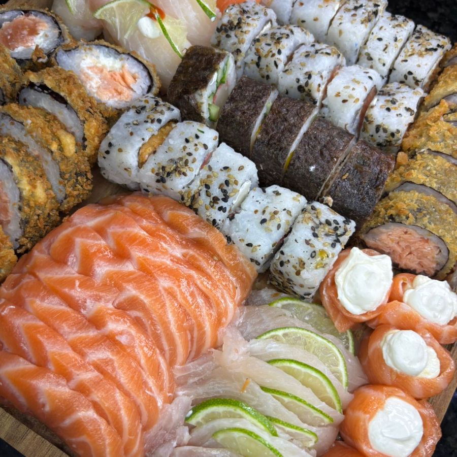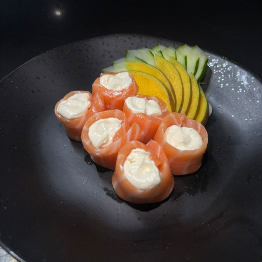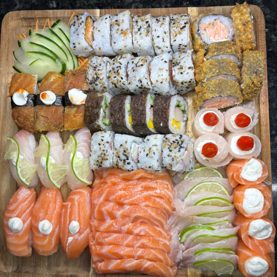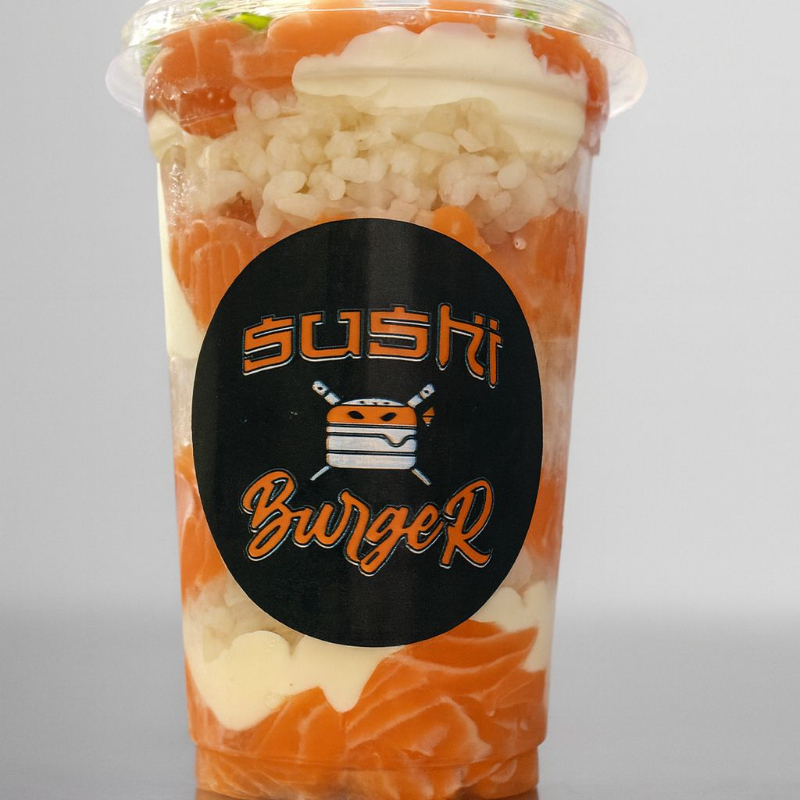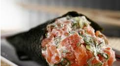 Arroz japonês empanado na farinha panco e frito, filé de salmão cream cheese, cebola, tomate e alface selado