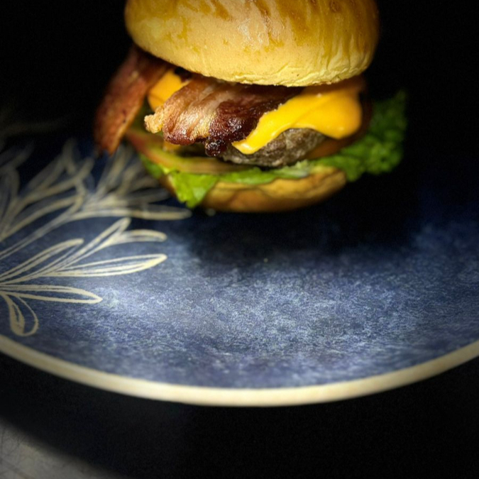Pão á sua escolha, dois hamburguer´s, queijo mussarela, cebola caramelizada bacon tomate e alafce