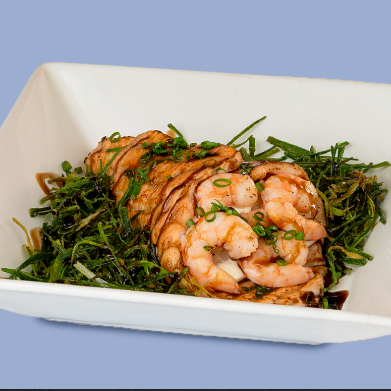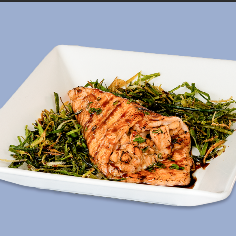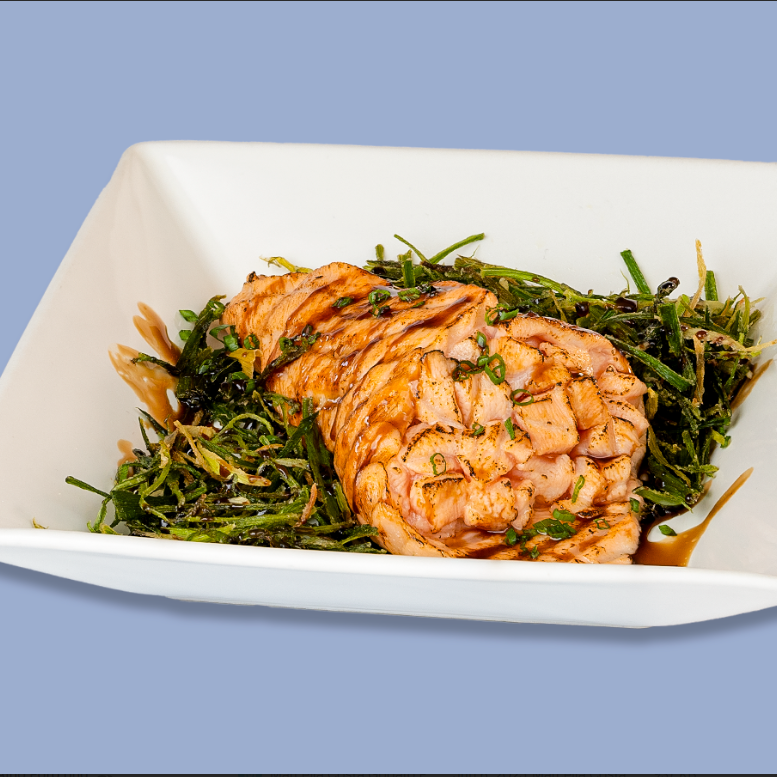 Filé de salmão fresco maçaricado, recheado com salmão ou camarão, arroz japonês, cream cheese e cebolinha, coberto com molho teriaki. Acompanha palha de alho poró.