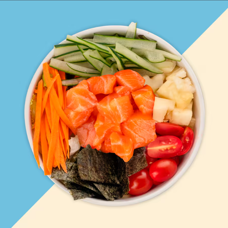 Poke leve e refrescante com salmão em cubos, alga nori, palha de alho-poró, tomate cereja, sunomono, abacaxi, cebolinha e molho shoyu light. Disponível nas bases de abobrinha ou folhas.