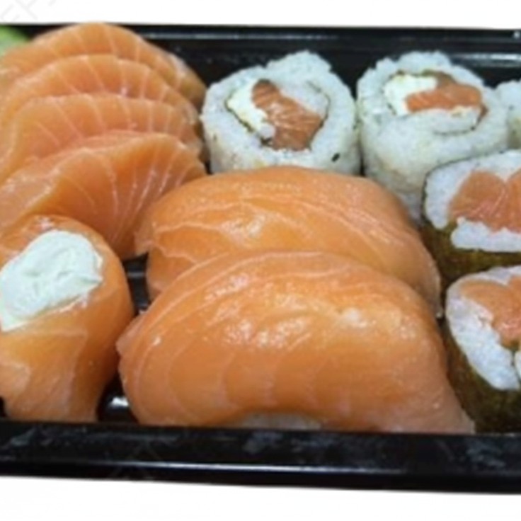 4 sashimis de salmão, 2 niguiris de salmão, 2 gunkas tasty, 3 uramaki filadélfia, 3 hossomakis shakemaki.