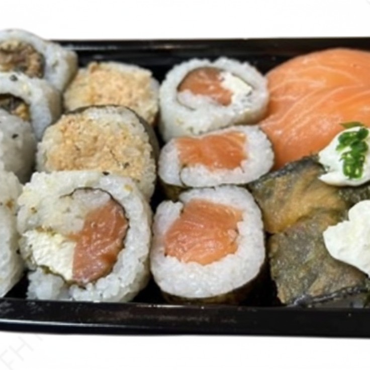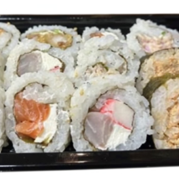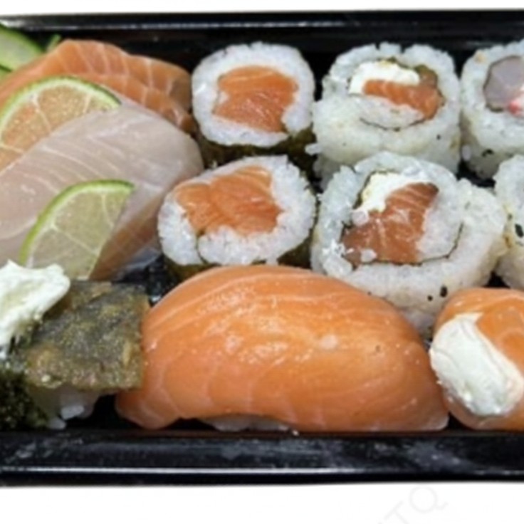 2 uramakis filadélfia, 2 uramakis skin, 2 uramakis dragon, 2 uramakis shiromi negui, 2 hossomakis shakemaki, 2 hossomakis terrine.