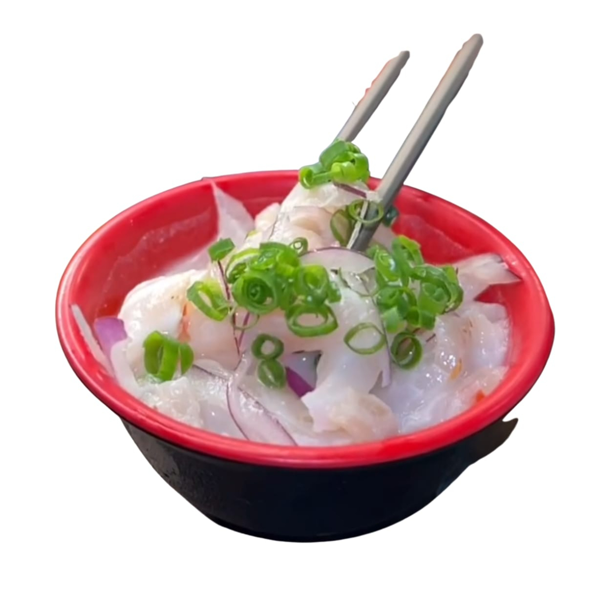cubos de tilapia,cebola roxa, pimenta de cheiro, pimenta dedo de moça ao molho tigre.