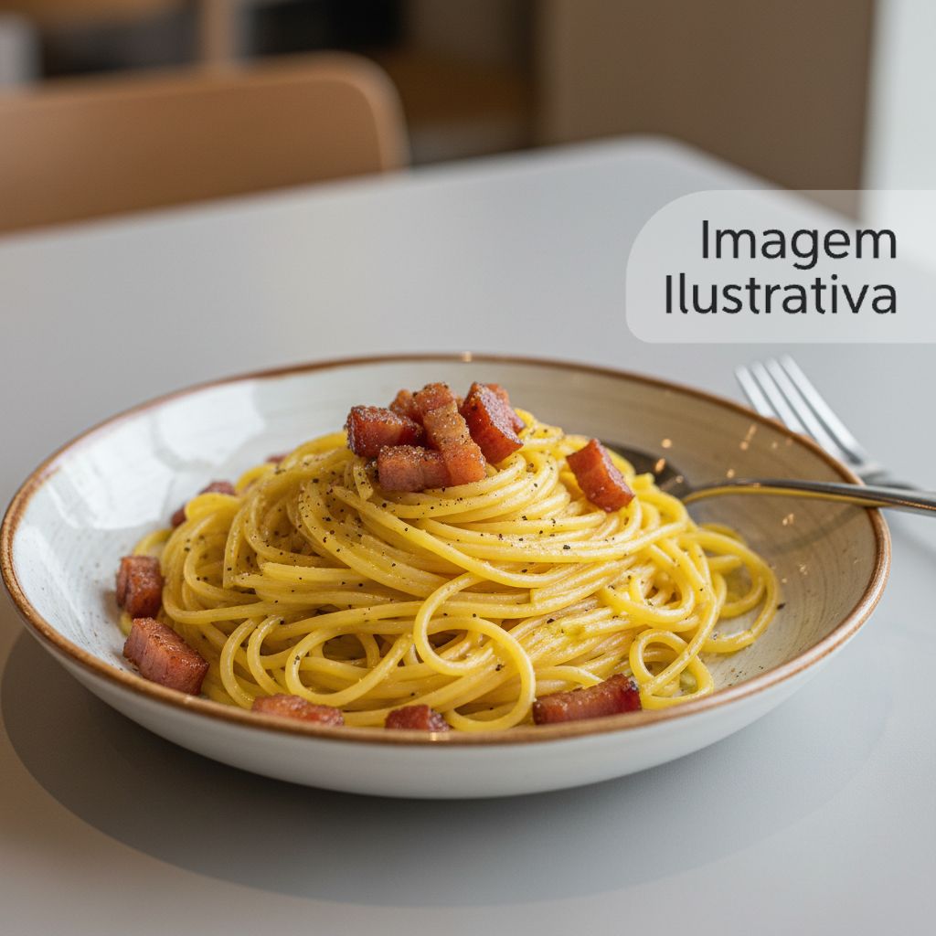 Espaguete cremoso com molho carbonara, preparado com ovos, queijo parmesão, pimenta do reino moída e bacon defumado.