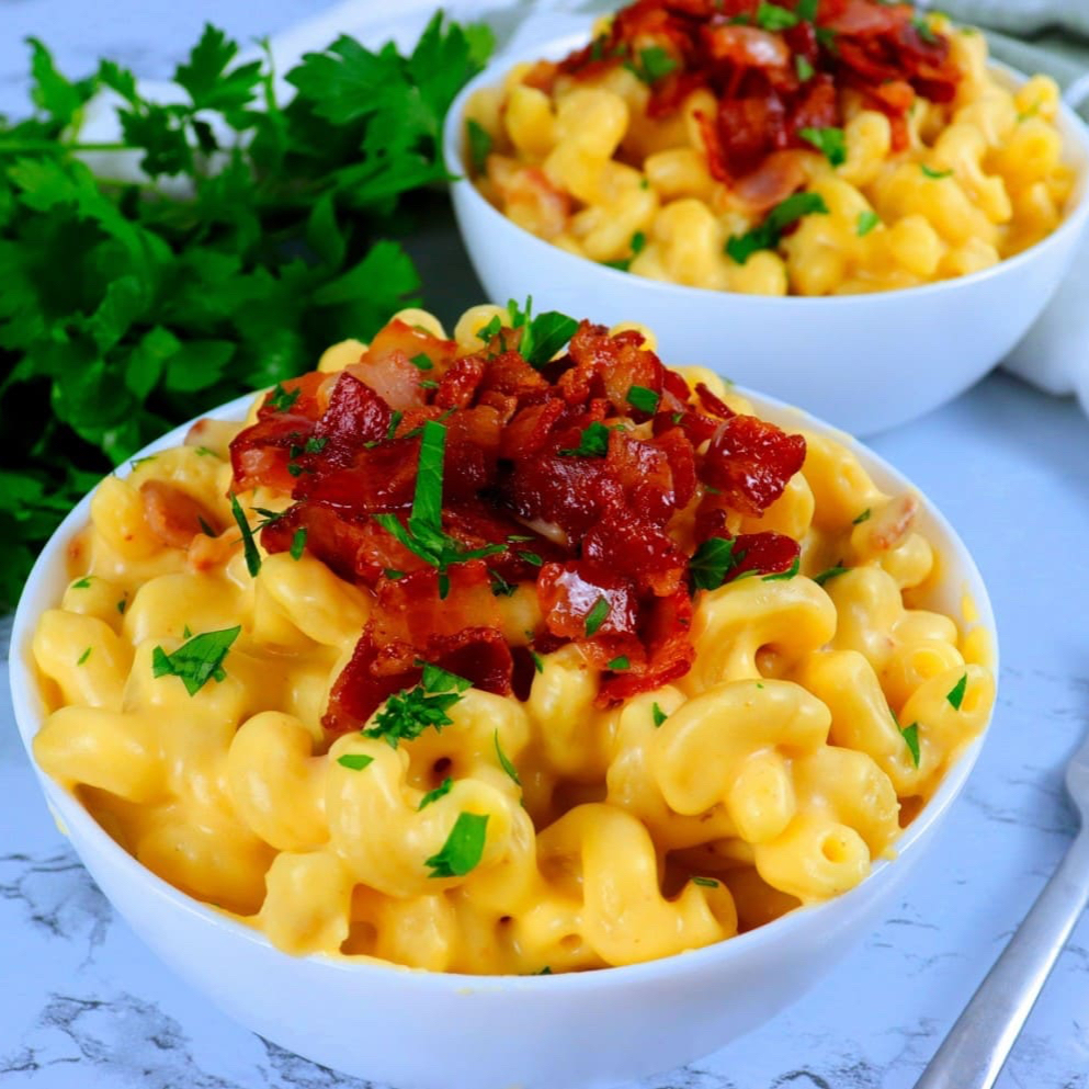 Macarrão Caracolino com molho cremoso de Cheedar, Bacon e um toque de Cebolinha Verde. Aproximadamente 700gm