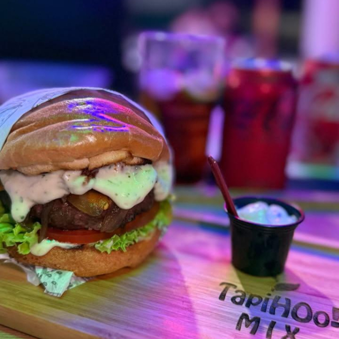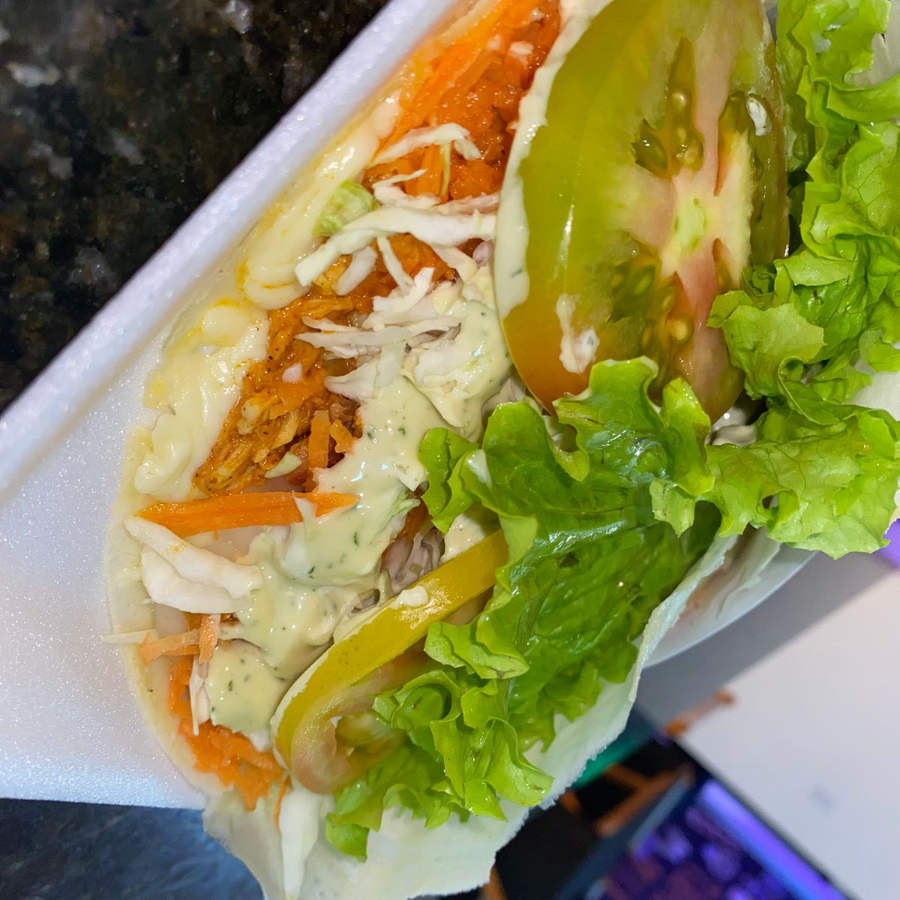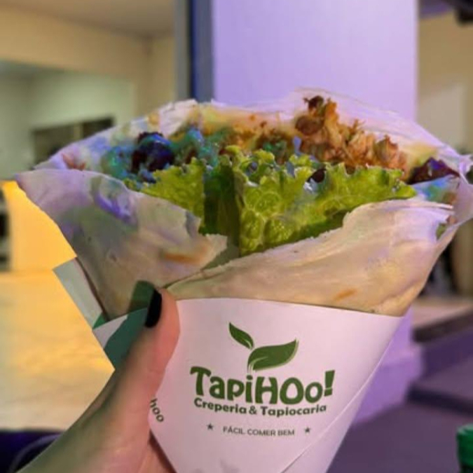 Que delícia! Uma tapioca da TapiHoo! recheada Carne de sol, molho verde cremoso e alface fresquinha. Perfeita para um lanche rápido e saboroso!