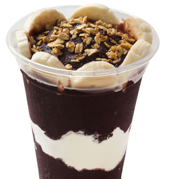 Uhm, que tentação! Essa imagem mostra um copo transparente cheio de uma deliciosa camada de açaí roxo escuro, intercalada com uma generosa porção de um creme branco (que pode ser leite condensado, creme de leite ninho ou iogurte, por exemplo). No topo, o açaí é coroado com bastante granola crocante e fatias frescas de banana, dispostas em círculo. É uma sobremesa ou lanche refrescante e nutritivo, com uma apresentação super convidativa!