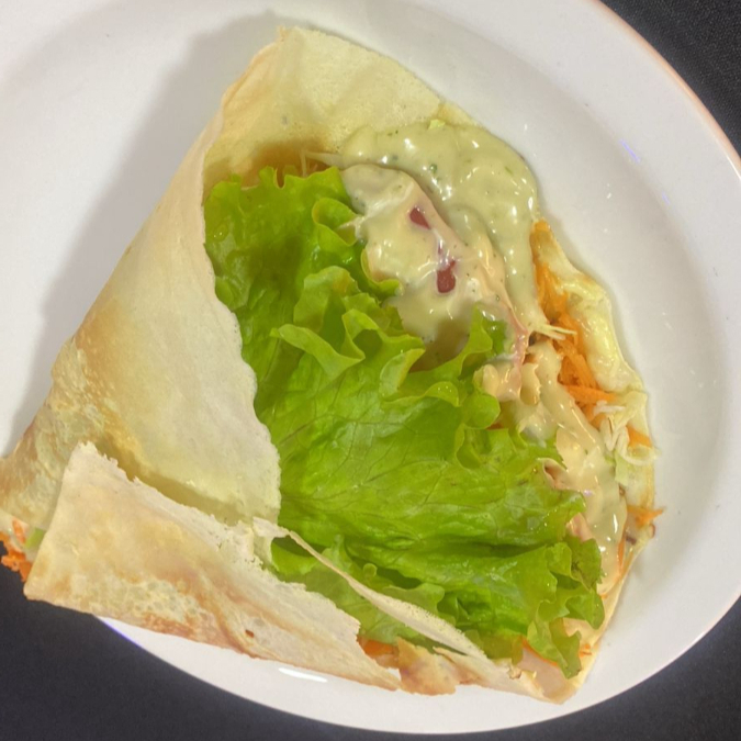 Uhm, que delícia! Essa foto mostra um delicioso crepe (ou talvez um wrap ou panqueca) dobrado, recheado com bastante alface verde fresca, um molho cremoso e o que parecem ser pedacinhos de frango ou outro recheio desfiado, além de alguns vegetais como cenoura ralada. Está servido em um prato branco, e a iluminação faz parecer uma refeição caseira e apetitosa.