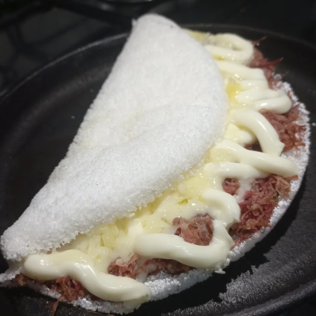 deliciosa tapioca de carne de sol desfiada com cetupiry tomate cebola