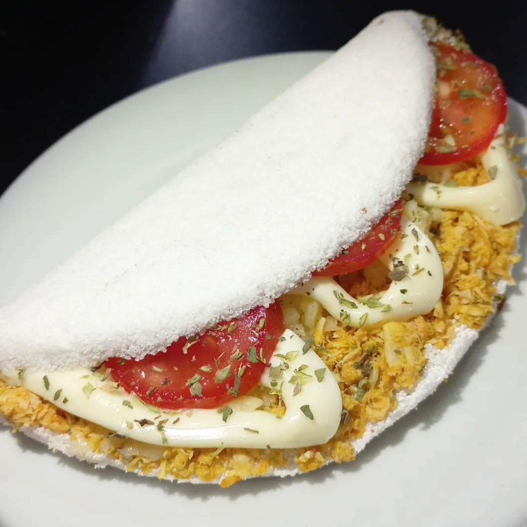 Tapioca recheada com frango catupiry tomate cebola