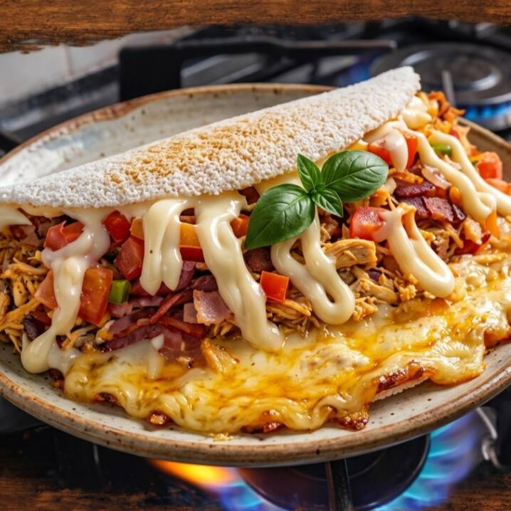 tapioca caprichada recheada com frango desfiado presunto tomate cebola bacon milho catupiry chedda e para finalizar uma borda de mussarela derretida