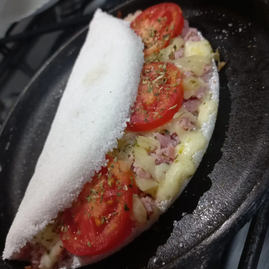 deliciosa tapioca de pizza recheada com presunto mussarela tomate cebola.e para dá aquele toque final orégano