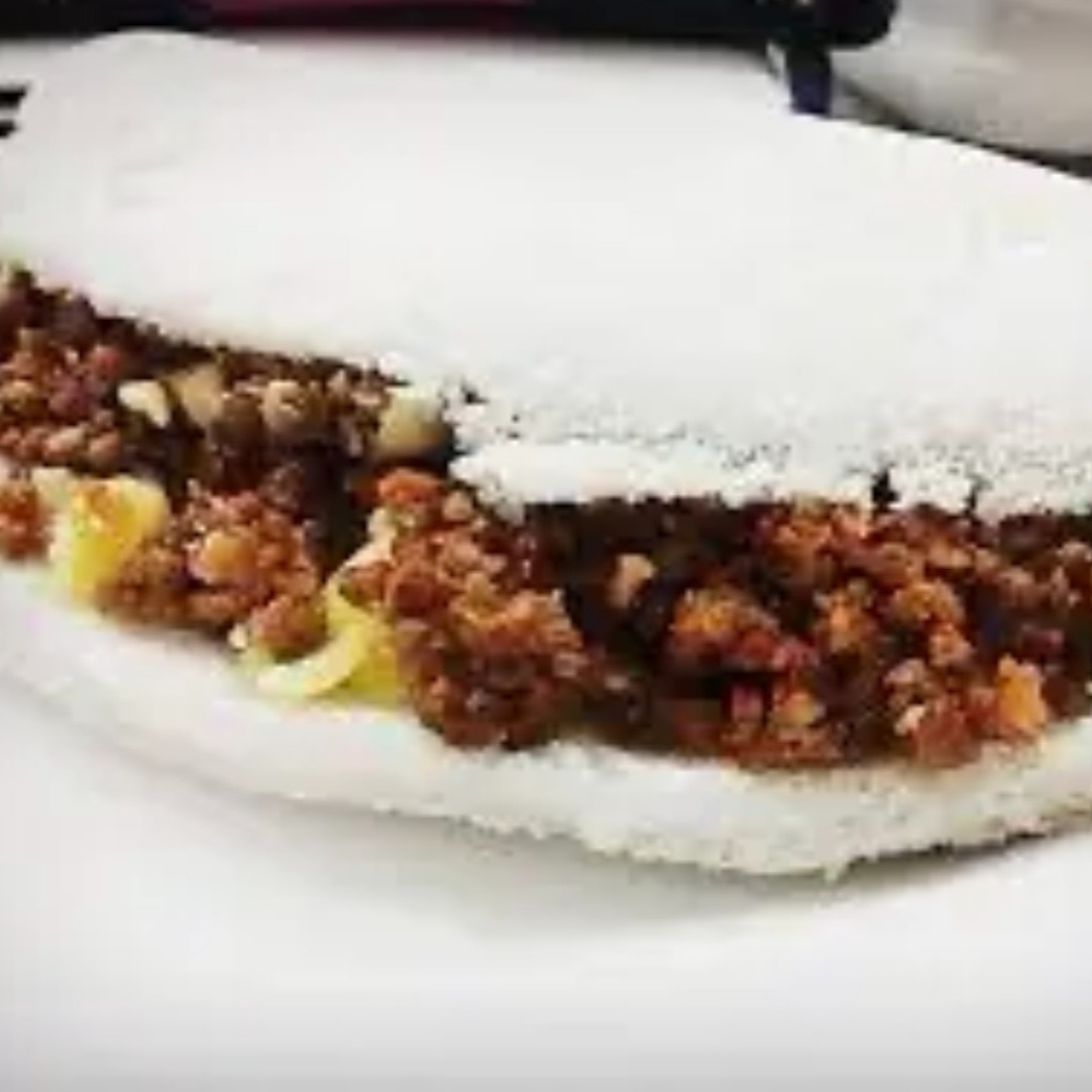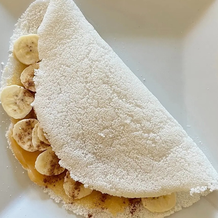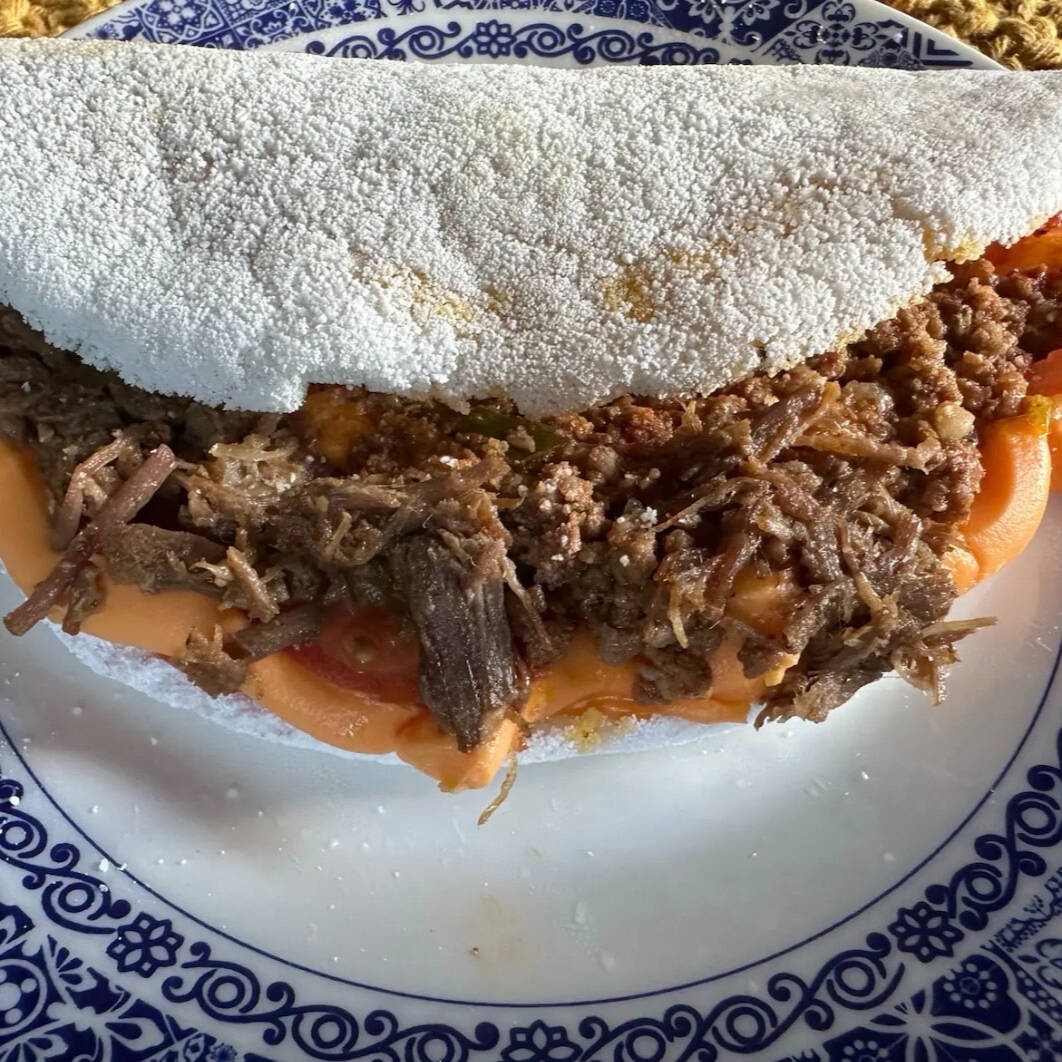 Tapioca recheada com carne artesanal desfiada, catupiry e tomates.