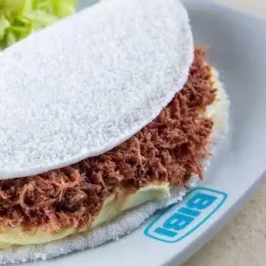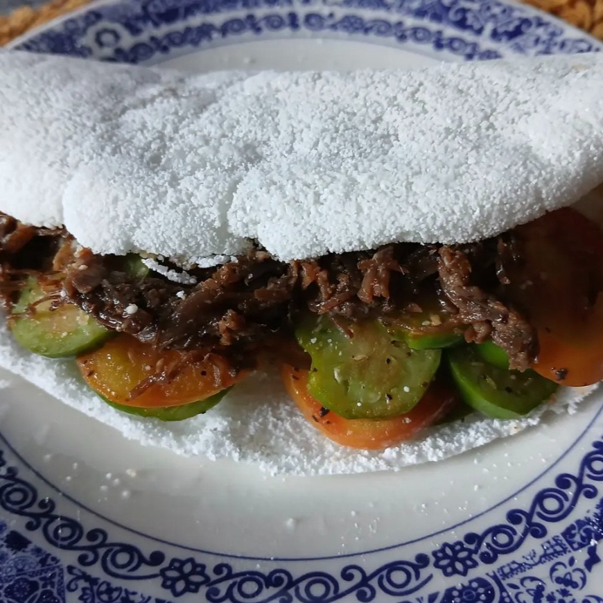 Tapioca recheada com carne artesanal desfiada, jiló, tomates e catupiry.